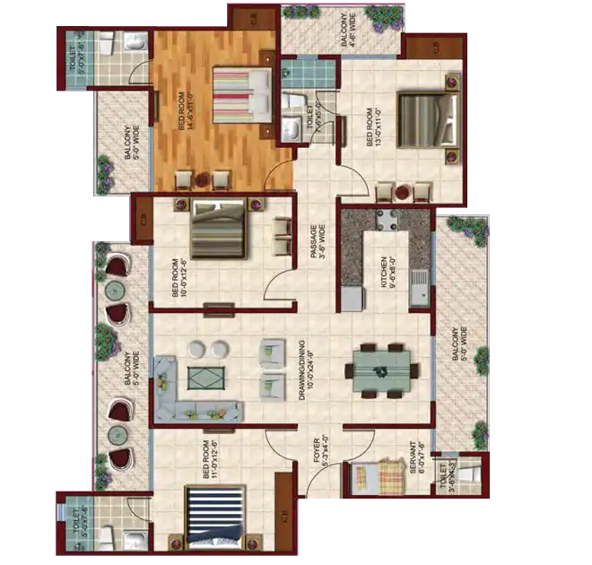 Vitrified Tiles In Drawing/dining/bedrooms And Kitchen. Anti-Skid Ceramic Tiles in Balcony. Laminated Wooden Flooring In Master Bedroom.